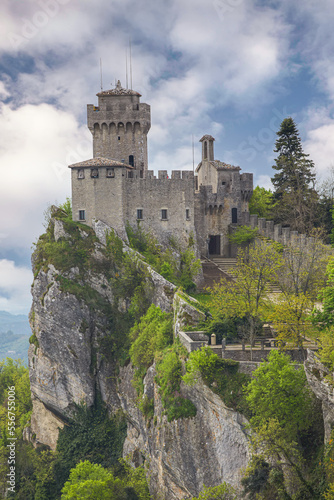 Cesta Tower on the peak of Mount Titan with a cloud filled sky on a sunny day; Republic of San Marino, North-Central Italy