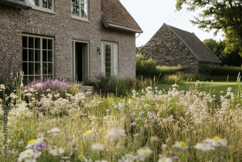 Charming countryside house surrounded by vibrant wildflower garden in the late afternoon sun showcasing natural beauty and tranquility
