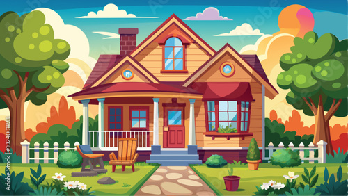 Charming Cozy House Exterior Vector Art A Peaceful Home in a Serene Background Illustration