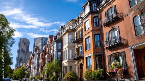 Charming Historic Brownstone Buildings Along City Street with Modern Skyscrapers in Background under Clear Blue Sky