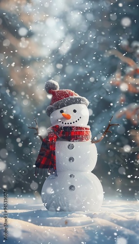 Charming snowman in a serene winter wonderland with gentle snowfall and festive atmosphere