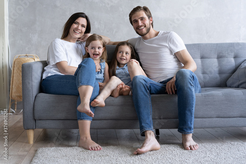 Cheerful family at home sitting in sofa