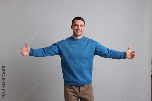 Cheerful man welcoming guests on light grey background
