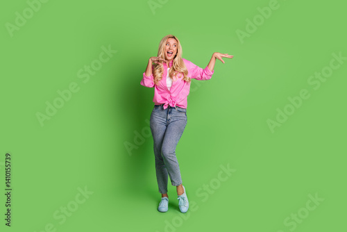 Cheerful woman in a pink shirt and jeans posing joyfully with a lively green background, expressing happiness
