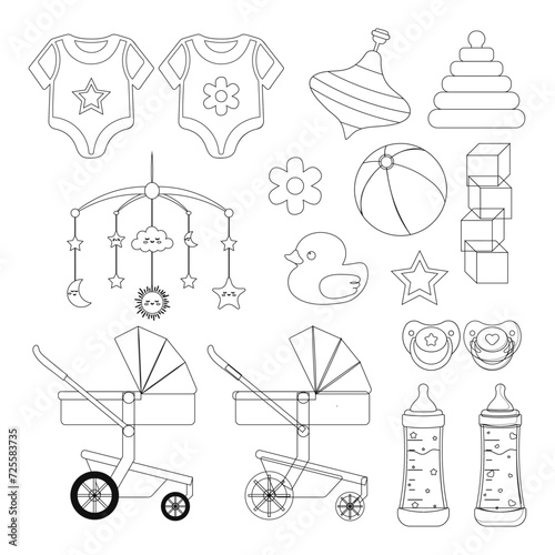 Children's elements set. Stroller, pacifier, bottle, sliders, cubes, pyramid. Vector illustration.