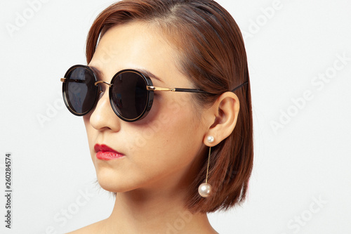 Chinese Girl wearing varies types of fashion sunglasses,looking sharp