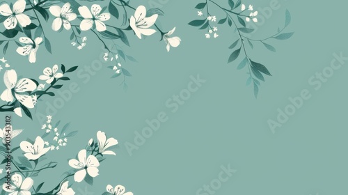 Chinese minimalism illustration, silhouette of a jasmine flower border, flat illustration Chinese illustration on muted turquoise background, summer setting, empty copy space