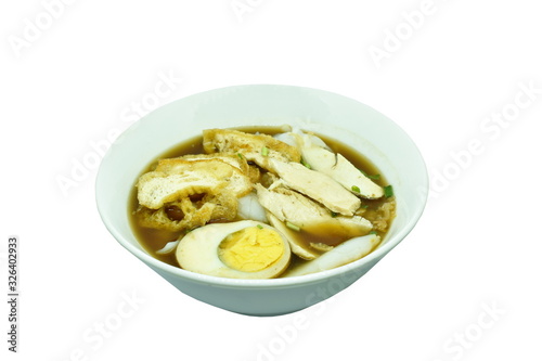 Chinese rice flour paste with slice chicken and fried tofu topping egg in brown soup