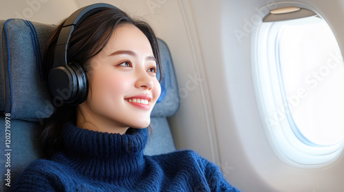 Chinese woman listening music enjoying flight and business trip by commercial plane