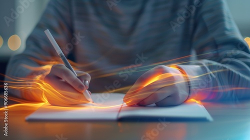 Choreographer in a dimly lit studio, scribbling notes in a notebook, double exposure blending with abstract colorful patterns, modern interior design details
