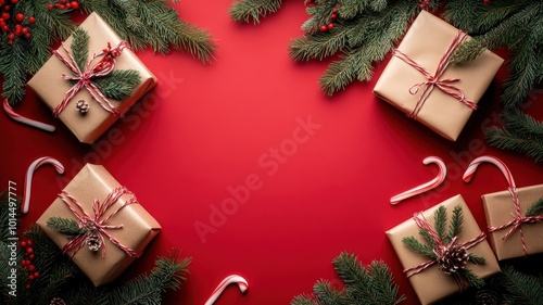 Christmas composition with Gifts,fir tree branches,Christmas, winter, new year concept,Merry Christmas design holiday frame,Flat lay, top view,sale promotion december month,copy space.