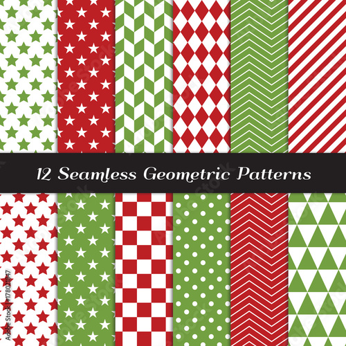 Christmas Red and Green Geometric Seamless Patterns. Backgrounds in Diamond, Chevron, Polka Dot, Checkerboard, Stars, Triangles, Herringbone and Stripes Patterns. Pattern Tile Swatches Included.
