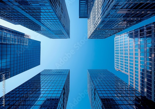 City downtown. Office tall building. Skyscraper high glass tower. Business cityscape exterior. Futuristic urban district. Finance corporate architecture. Modern center building