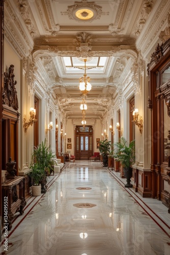 Classic european hall interior features grand, ornate design with high ceiling, marble floor, intricate carvings. Concept of classic european hall interior emphasizes opulence, decor, elegance.