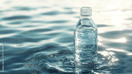 Clear floating bottle with sparkling liquid in calm water, reflecting light. scene evokes freshness and tranquility, perfect for hydration themes