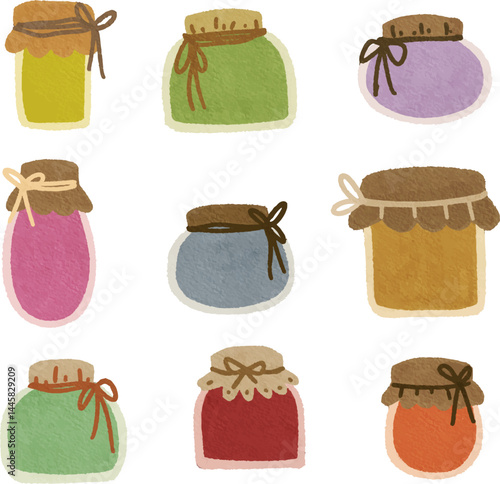 clip art watercolor illustration of colorful bottle and jar of sweet fruit jam for background asset