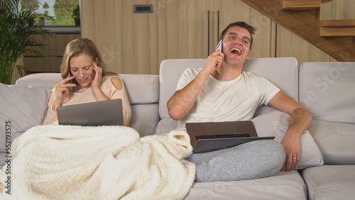 CLOSE UP: Busy couple having business calls while working remotely from home