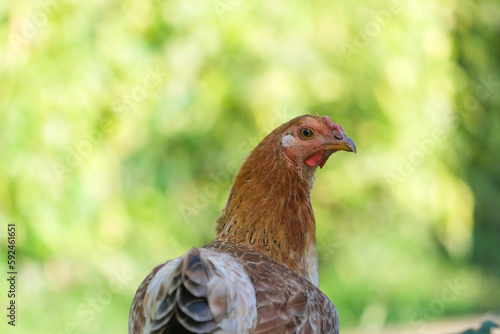 Close up colorful brown chicken with isolated green background. Selective focus of chicken. Available cut out shape from image. Open space area.
