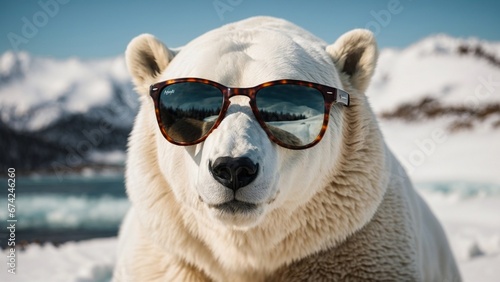 Close up high resolution image of cool polar bear wearing sunglasses. Generative AI.