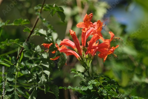 Close up of beautiful orange flower of Tecomaria capensis, the Cape honeysuckle on bush in garden. Met on La Gomera, Canary Islands, Spain