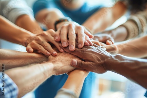 Close up of diverse people hands putting hands together and reaching hands at center, collaboration, teamwork, cooperation, teamwork, supporting.