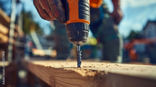 Close Up of Power Drill Screwing Wood on Construction Site