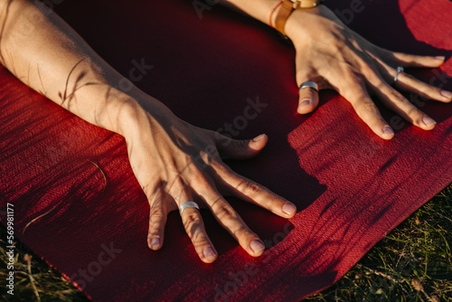 Close Up Unrecognisable Woman Holding Her Hands on the Mat During Yoga Outdoors at Sunset