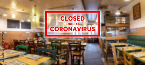 Closed due to coronavirus sign on defocused empty restaurant room