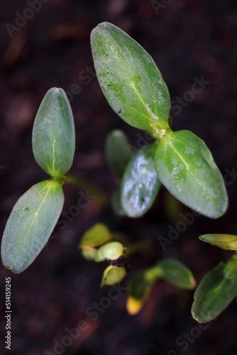 Closeup A sapling of a cucumber tree that grows out of the soil and is dusted with water