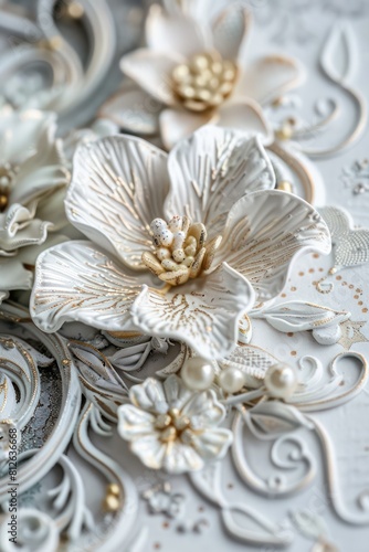 Close-up image featuring intricate white paper art of flowers with golden accents, suggesting sophistication