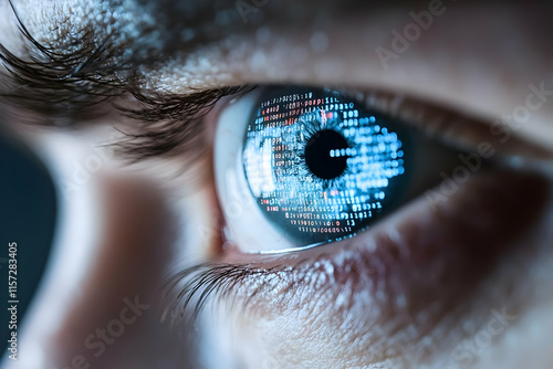 Close-up of a blue eye with digital code reflected in the iris, symbolizing technology and data.