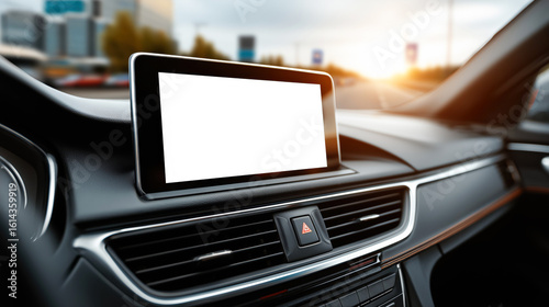Close-up of a car dashboard with a blank infotainment screen, set against a blurred cityscape and golden sunset, ideal for automotive interface mockups and tech display presentations