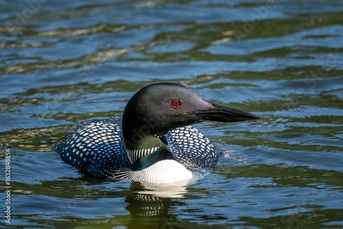 Close-up of a common loon with striking red eyes and patterned plumage swimming in a lake.