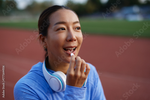 Close-up of a focused young Asian female athlete taking a sports supplement pill or vitamin on a running track as part of her fitness and nutrition routine