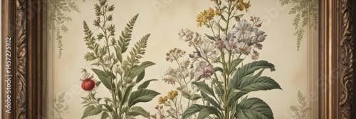 Close-up of a framed, antique botanical illustration, delicate details visible, drawing, tone, artwork