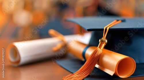 close-up of a graduation cap with a custom-designed tassel and a diploma on a desk, symbolizing the achievement and tradition of graduation, with ample copy space for text