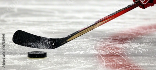 Close-up of a hockey stick poised to strike a puck on the ice, capturing the essence of fast-paced ice hockey gameplay.