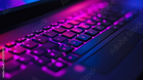 Close-up of a laptop keyboard illuminated with pink and blue lighting creating a technological feel