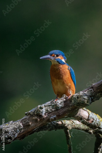 Close-up of a male Eurasian Kingfisher perched on a thick wooden branch, facing the camera lens against a dark green background on a cloudy autumn day.