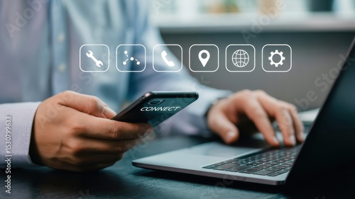 Close-up of a person using a smartphone and laptop, with support icons overlaid.
