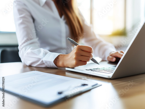 Close-up of a person working on a laptop with a pen in hand, business concept on a blurred background. Generative AI
