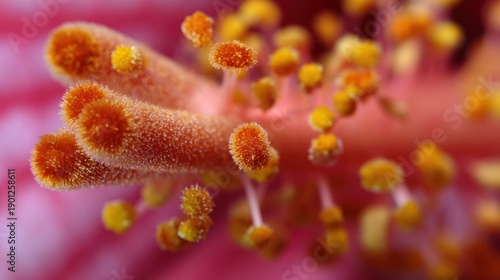Close-up of a pink flower with orange stamens and pistils, set against a blurred pink background.