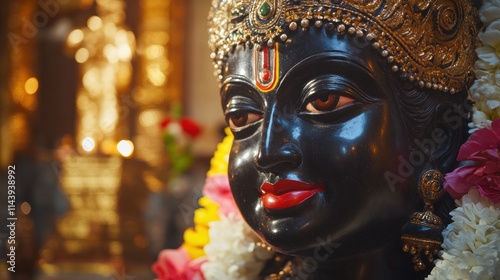Close-up of a serene black deity statue adorned with flowers, in a temple setting.