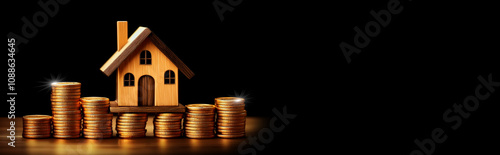Closeup of a small wooden model house on the top of a stack of golden coins, on a wooden shelf or table, isolated on a black background with copy space, blank wide banner. Generative Ai.
