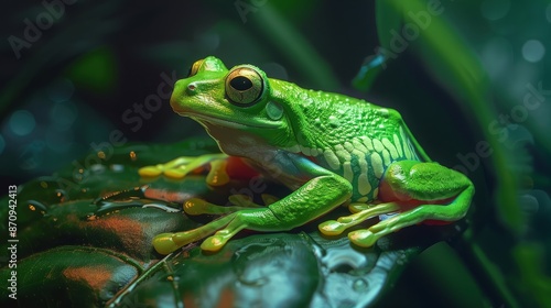 Close-up of a striking neon green tree frog perched on a leaf