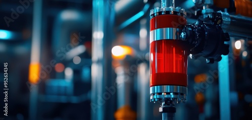 Close-up of a vibrant red industrial valve in a modern factory setting, showcasing advanced piping and mechanical engineering.