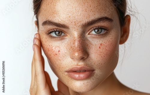 Close-up of a woman with clear skin and freckles touching her face while highlighting natural beauty and skin care