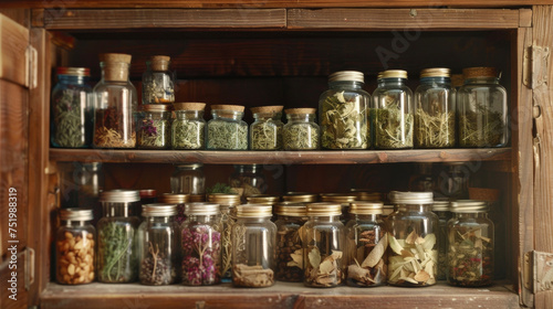 Closeup of a wooden cabinet filled with neatly labeled jars of dried herbs each with its own unique healing properties.