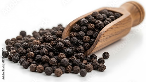 Close-up of aromatic black peppercorns spilling from a rustic wooden scoop, showcasing the essential spice ingredient for culinary seasoning on a clean white background