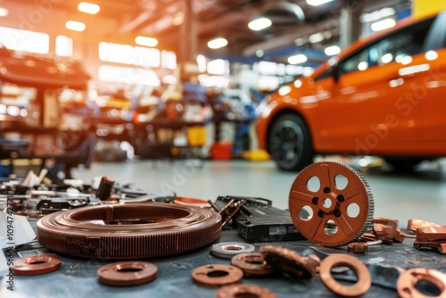Close-up of Auto Repair Shop Floor with Car Parts Displayed, Highlighting Various Components and Tools Used for Car Service and Maintenance in a Workshop Environment